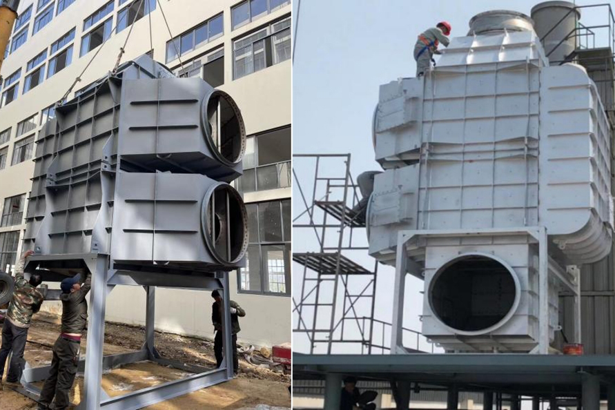 在磷化工、石墨、有色冶煉等行業,生產排放的飽和濕煙氣與低溫環境空氣接觸時,在煙氣溫度下降過程中,煙氣中的水蒸氣過飽和凝結,凝結水滴折射和散射光線,使煙羽呈白色或灰色,稱為濕煙羽。由于冬季溫度較低,相關問題的環保投訴較多。那么,有哪些種煙氣脫白技術?各種煙氣脫白的技術原理是怎樣的?1、冷凝相變煙氣脫白技術冷凝相變煙氣脫白原理為:煙氣經濕法脫硫后,含濕量上升,為B狀態,進入換熱消霧模塊后。干態空氣A入換熱消霧模塊兩者交換后,A溫度上升,含濕量不變,相對濕度降低,處于C。B煙氣,溫度降低,相對濕度不變,含濕量降低,液滴析出,轉為D。D和受熱C流出換熱消零模塊,在氣室中混合,使D溫度下降,濕度降低:C溫度上升,相對濕度上升,兩種狀態的煙氣混合,最終達到F狀態,AF連線始終處于不飽和狀態,因此,不會出現可見白煙或霧氣團。可以看出,冷凝混風技術是煙氣脫白的較好技術路線,特別是在北方寒冷地區,單純的煙氣再熱很難消除煙囪白煙。2、低電耗離子束煙氣脫白技術低電耗離子束煙氣脫白原理為:高速電子射流擊穿煙氣,產生正負離子體基團,煙氣中氣溶膠、飽和水滴、微小顆粒物在離子束的撞擊下,不斷發生凝聚效應,顆粒物和水滴快速凝聚成團,在重力作用下,落到離子束除變器底部流入脫硫塔或廢水收集池,達到降解顆粒物,氣溶膠和水零的目的。廢氣中的氨氧化物,由高速電子束提供能量,快速與氨氣發生還原反應,生成副產物水。低電耗離子束煙氣脫白優點:1.放電產生的離子體中,電子能量高,幾乎可以和所有的惡臭氣體分子作用。2.反應快,不受氣速限制。采用防腐蝕材料。3.用電成本低,操作極為簡單,無需派專職人員看守,基本不占用人工費。4.設備啟動、停止十分迅速,隨用隨開,不受氣溫的影響。
